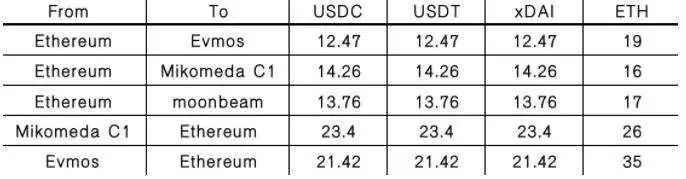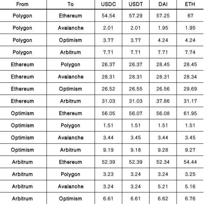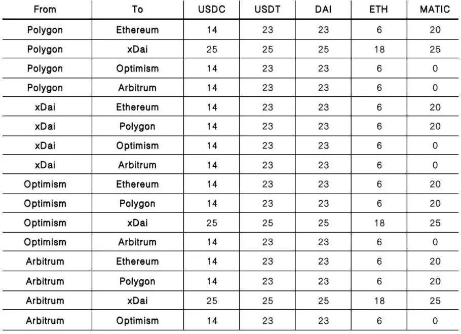 发送链(home chain)产生一系列消息(document),签约公证人(updater)签署。如果公证人出示伪造的副本,会收到惩罚且广播,所有客户都知道其是恶意的,便可阻止访问其账户。Nomad 以乐观证明为原型,发送一些数据证明,在计时器过去后接受为有效,同时引入挑战者提交欺诈证明。Nomad 跨越多个链。发送链是消息的来源,消息被提交到 merkle 树(“消息树”)中。这棵树的根由更新者公证,并在“更新”中通过 relayer 中继到接收链。更新由更新者签名。他们承诺前一个根和一个新根。任何链都可以维护一个“副本”合约,其中包含更新者和当前根的知识。已签名的更新由副本持有,并在超时后接受。这留下了更新程序(updater)签署欺诈更新的可能性。与乐观的汇总不同,Nomad 允许欺诈,这是安全模型最重要的变化。重要的是,始终可以向发送链上的 Home 合约证明欺诈行为。因此,更新者必须在发送链上提交抵押权益。欺诈总是可以在发送链上被证明,并且可以削减保证金作为惩罚。注:本表的数据是以太坊 $2540 时的测算,费用随着以太坊 gas 费用变化而变化。由于测算时间不同,网络拥堵情况不同,结果存在较大波动,仅供参考。Nomad 团队具体人物不详,创始团队有超过 4 年致力于互操作性的经验。种子轮融资 2240 万美元,由 polychain capital 领头,其余投资者包括 the graph、celestia、amber group、mina、circle、avalanche、1kx、polkadot、A&T capital、coinbase 等 27 个。Connext 的优势在于实现了跨链和和 L2 Trustless 发送价值和调用合约,但缺点是不允许完全通用的通信,但它的延迟确实要低很多。依赖于 Nomad 高安全性,吸收 Nomad 的信任/风险。利用 Connext 的低延迟流动性池,允许最终用户在几分钟内完成转账,而不是延迟超过 30 分钟。据 Connext 官方报告称,鲸鱼和机构将需要更长的 35 分钟来完成 Nomad 的桥接时间。Connext 与 Nomad 就是低延迟的流动性+安全性结合,随着 Connext 流动性的增长,Nomad 的采用未来也可能会逐渐倾向机构资本或大资金体量。