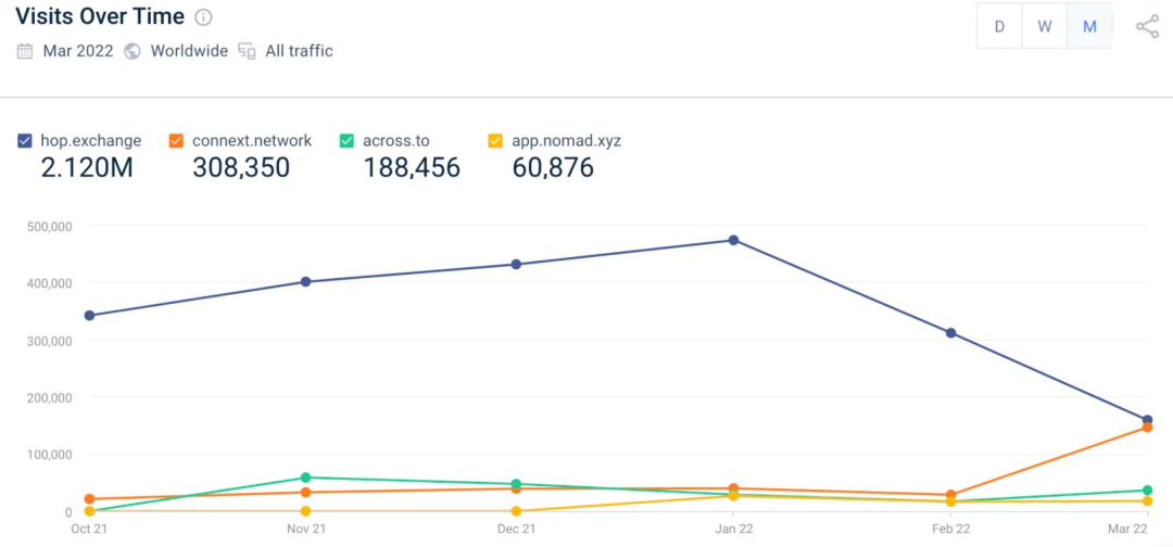 从场外热度看,Hop bridge 目前仍然一骑绝尘,Connext 与 Nomad 的集成造成的热度导致大众对其关注也逐渐增加。
