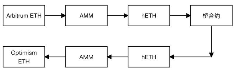 Arbitrum 官方铸造的 ETH,通过 AMM 转移为 hETH,然后通过桥合约锁定 Arbitrum 链上的 hETH,在另外一个桥铸造 hETH,再通过部署在 Op 上的 AMM 转换成 Op 官方铸造的 ETH。