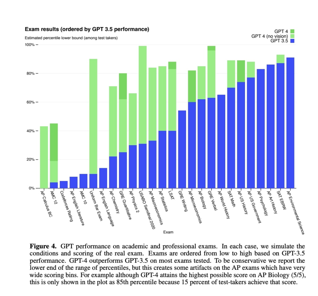 左图,2022 年 12 月,研究员测试 ChatGPT(GPT 3.5) 使其成功的通过了法律考试。右图,GPT4 击败了 90% 参加律师资格考试的人类(Casetext 赞助)。