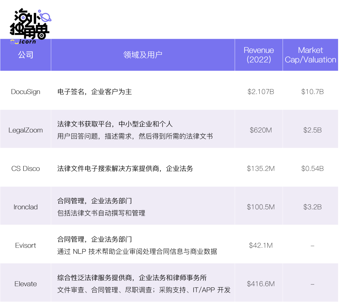 不过,如果和其他企业主要职能领域相比,在 Legal Tech 领域,除了电子签头号玩家 DocuSign 外,尚没有诞生其他数十亿美元收入量级的企业级软件公司。