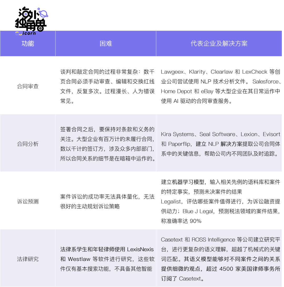 通常而言,律师的工作环节主要包括以下方面:客户诉求的沟通与拆分、法律研究(法条检索和判例研究)、客户方案设计、合同、诉讼文书或其他法律文件的处理,以及其他涉及到法律适用问题的工作。部分 LLM 创业公司想成为律师的通用性法律助理,协助律师的所有日常工作环节;部分专注合同及法律文件的处理这一细分环节。