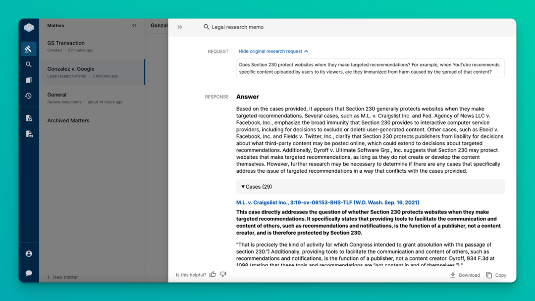 此外,LLM 一直被诟病的幻觉问题同样也会发生在 Harvey 。为了减轻影响,Harvey 使用大量专业数据进行微调,还做了大量数据隔离和企业的安全与合规。免责声明表示使用应在法律专业人士的监督下进行,对生成的任何信息进行核查。目前 Harvey 在通用法律上表现良好,但是在细分法律领域仍表现较差,更容易出现“幻觉”。