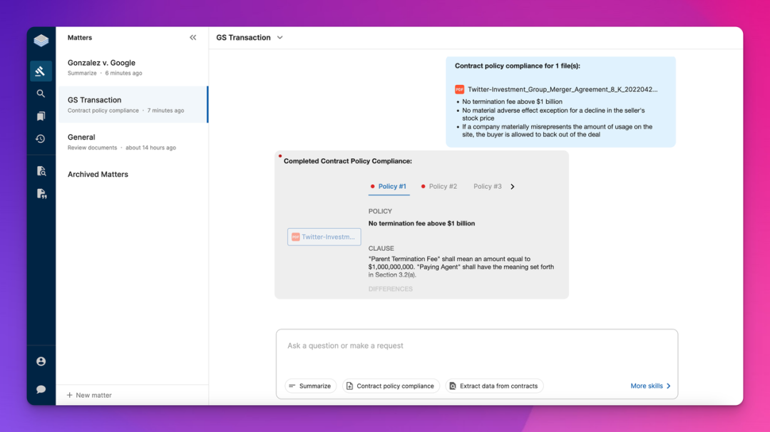 1. CoCounsel 通过私人专用服务器和零保留的 API 访问 OpenAI 的 GPT4 模型。所有数据在传输过程中都被加密。这意味着 OpenAI 存储任何客户数据的时间不能超过处理请求所需的时间,并且不能查看任何这些数据或使用它们来训练 CoCounsel 的底层 LLM。用户始终保留对数据的控制权,并可以在任何时候将其从平台上完全删除。