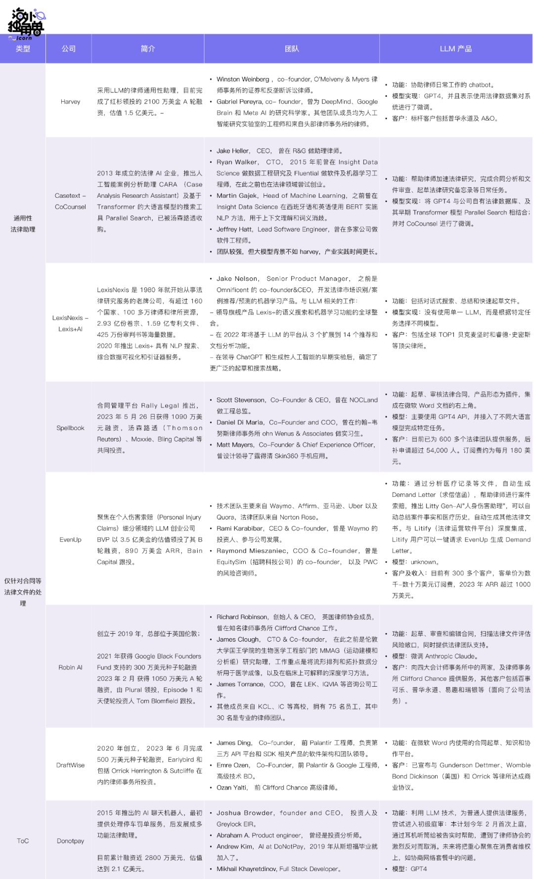 因为大模型训练能力、行业专业数据库、深入大客户工作流这三点是成就法律 LLM 公司的关键,所以从这三个方面来看,以上公司的差异如下: