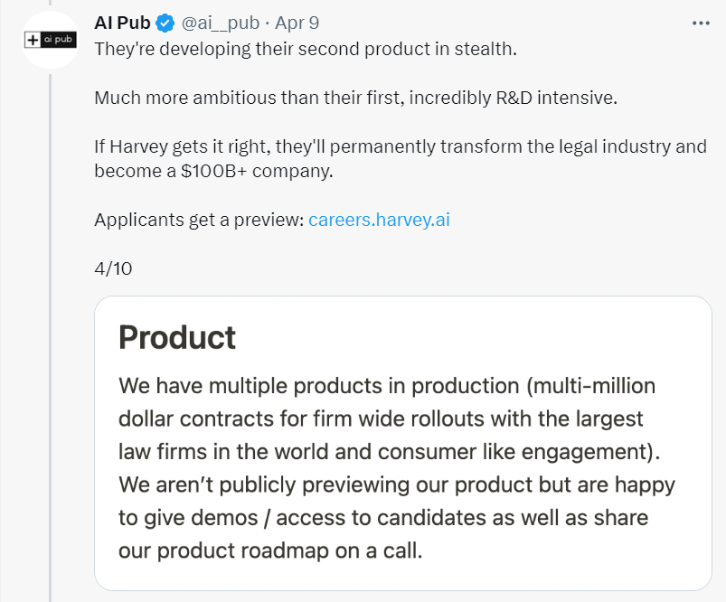 Harvey 的第一款产品目前还在内测阶段,而根据其外部招聘负责人 Brian Burns 在其 Twitter 账号 AI Pub 上的发言,Harvey 还在秘密开发第二款产品,“比第一个产品更雄心勃勃,研发强度极高”。