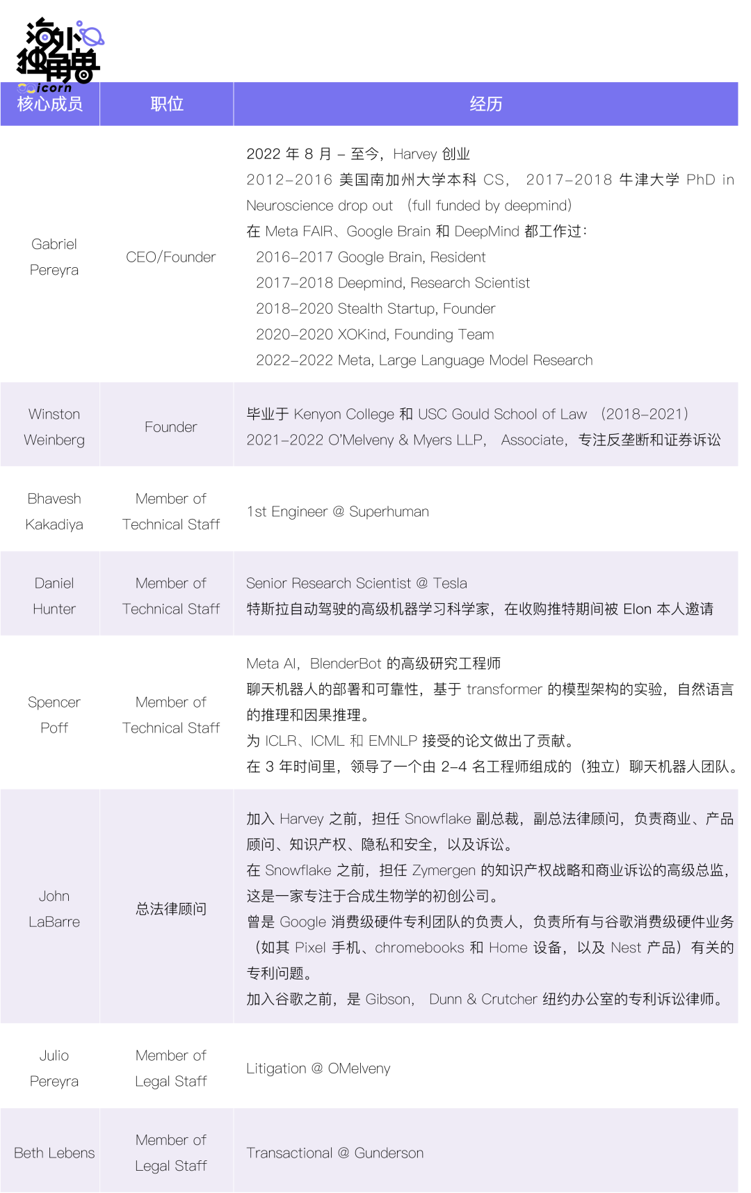 公司核心团队均有出身于头部律师事务所的律师,但除了 Harvey 之外,绝大部分公司缺少大模型背景的创始人。