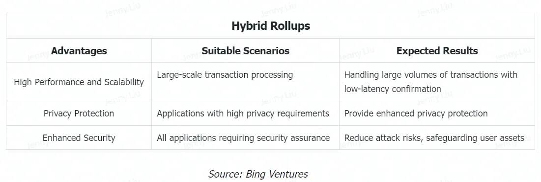 Compliance and Privacy Protection: Hybrid rollups combine the best of the two rollup schemes. Benefiting from the ZKP technology used, they will be able to guarantee the privacy of transaction data and provide verifiable transaction execution. Therefore, they can be used to provide compliance and privacy protection solutions to sectors such as tokenized real-world assets (RWAs) or institutional users that have higher requirements for compliance and privacy protection.