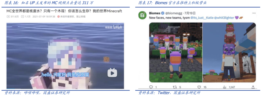 3)UGC:助力应用快速推开。根据 Octoly 于 2016 年 8 月发布的数据,与 MC 相关的视频在 Youtube 上的累积播放量达到 353 亿次,其中来自 MC 官方的视频只占 1%。明星玩家依托互联网平台发布视频吸引粉丝,也反过来提升了游戏的黏着度。Biomes 官方注重游戏社区的运营,在推特上积极营业,转发用户体验和游戏的最新动态。