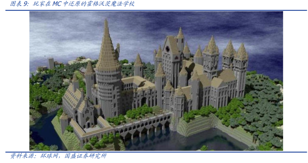 破圈级体素游戏《我的世界》。以最著名的体素游戏 Minecraft(我的世界,简称 MC)为例,玩家通过收集不同材质的方块,例如木头、矿石等,进行各种创造,小到斧头、桌子、栅栏,大到房屋、农场等。MC 高度的自由性吸引了无数玩家的追捧,2016 年 6 月,微软公开 MC 月活用户量达 4000 万,而占据 MMORPG 市场半壁江山的《魔兽世界》的高峰月活量也仅为 1200 万。