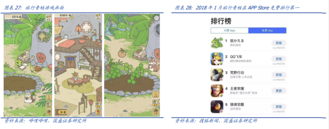 旅行青蛙游戏情节丰富,以高度拟人化体验增提高游戏可玩性。旅行青蛙作为 2018 年火爆出圈的小游戏,没有出众的游戏画面效果或丰富的游戏角色,而是单纯通过设置丰富的游戏情节,如一日三餐、各地旅行、寄明信片、牌照等一些列高度拟人化的游戏体验,来拢获游戏玩家心智。自 2017 年 12 月 21 日上架后一个月的时间内,该游戏在全球 App Store 中积累了 1000 万次下载。但由于情节、道具仍是固定的,所以旅行青蛙仍属于拟人化的线性游戏,玩家持续游玩的兴趣不强。根据 TapTap 按照近期下载热度计算的热门榜,《旅行青蛙:中国之旅》已经脱离放置类前 50 名的榜单。
