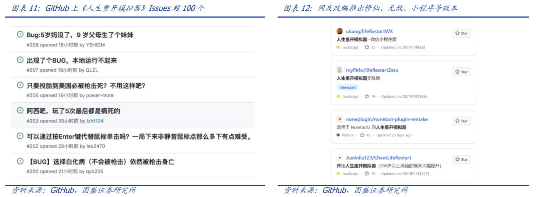 社区力量推动游戏版本更新。《人生重开模拟器》玩法简单,玩家只需要在游戏开局前完成智力、颜值等属性的分配,并选择人生加成条件,在几十秒乃至几秒内完成一次模拟人生的轻量化体验。该游戏的策划和开发仅由两个人完成,原始版本存在许多漏洞,登录 GitHub 后在网友的测试和编译下,以零成本完成了游戏的更新迭代。
