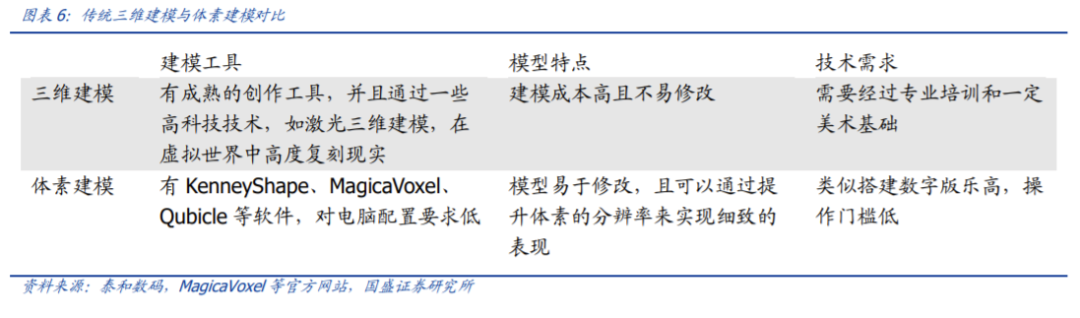 体素建模极大降低成本的同时提高了真实度。在当前追求画面逼真度的主流趋势下,体素游戏牺牲视觉效果,坚持用方块来构建游戏世界。相较于传统建模,体素建模具有操作门槛低、模型易修改的特点,且不同于三维建模仅是在视觉上做出三维立体的感受,体素建模所搭建的世界是真实三维立体的。方块堆叠的搭建方式和真实世界中一砖一瓦搭建类似,这使得用户可以在游戏世界中真实「搬砖」创造物体。