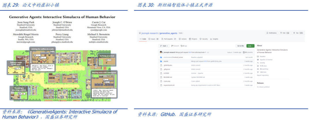 AI 智能体,AGI 的开始。OpenAl 联创 Andrej Karpathy 曾表示 AI 智能体是未来 Al 的前沿方向,大家普遍认为 AIGC 的诞生是为了降本,而我们认为,随着我们越来越接近 AGI,AI 将不再局限于「copilot」助手,而成为构建未来人类社会的基础框架。我们认为 AI 的第一性原理正是以 AI 为本。我们看好斯坦福小镇等由「AI 生成内容」和「拥有自然语言界面」的游戏应用,看好小镇居民等具有类人类意识的 AI 智能体,它们将让人类体验到更新奇的内容世界,或许未来是用户加入 AI 自驱动的赛博空间。