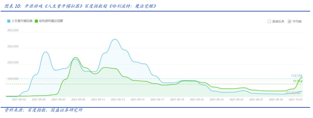 「三无」游戏热度超越热门 IP 手游。2021 年 9 月 3 日开源游戏《人生重开模拟器》在百度贴吧发布,在无预热、无广告、无营销的情况下,其百度搜索指数仍然一度超过同期著名 IP 改编的游戏《哈利波特:魔法觉醒》。