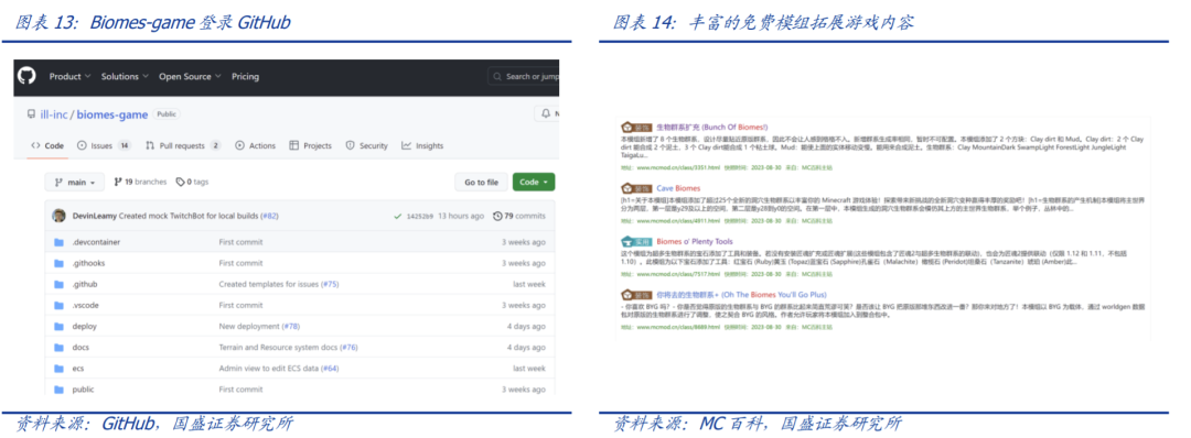 社区自产免费模组丰富游戏内容。Biomes 被称为开源版 MC,玩家可以直接在浏览器中进行建造、觅食等活动,自由探索一个由不同生物群系组成的世界。游戏上架 GitHub 后可玩性进一步增强,玩家可在社区中免费下载其他玩家制作的地下生态、深海生态等模组。