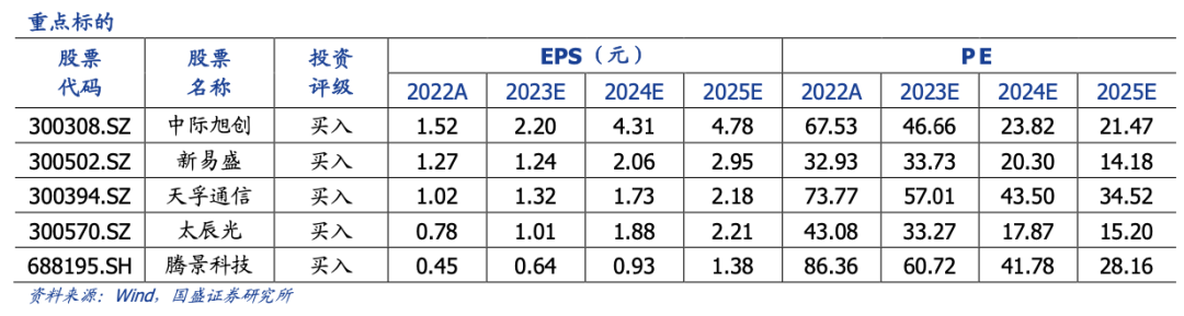 光通信:中际旭创、新易盛、天孚通信、太辰光、腾景科技、德科立、联特科技、华工科技、源杰科技、剑桥科技、铭普光磁。