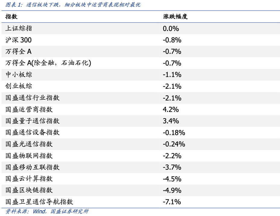 二、行情回顾:通信板块表现下跌,运营商表现最佳