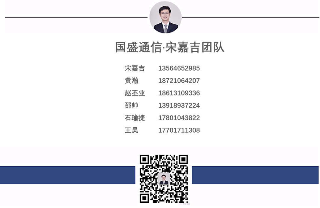 重要声明:本订阅号是国盛证券通信团队设立的。本订阅号不是国盛通信团队研究报告的发布平台。本订阅号所载的信息仅面向专业投资机构,仅供在新媒体背景下研究观点的及时交流。本订阅号所载的信息均摘编自国盛证券研究所已经发布的研究报告或者系对已发布报告的后续解读,若因对报告的摘编而产生歧义,应以报告发布当日的完整内容为准。本资料仅代表报告发布当日的判断,相关的分析意见及推测可在不发出通知的情形下做出更改,读者参考时还须及时跟踪后续最新的研究进展。