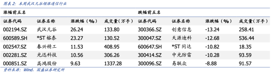 本周受益 5G 设备产业链概念,武汉凡谷上涨 26.24%,领涨板块。受益公司预重整,*ST 榕泰上涨 23.27%,受益 5G 设备产业链概念,春兴精工上涨 11.53%、光迅科技上涨 10.56%,受益自动驾驶概念,高鸿股份上涨 9.63%。