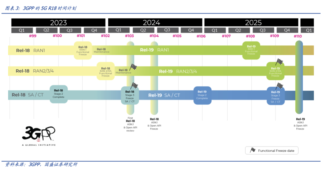 这种半代概念的背后是 3GPP 组织对通信网络制式的定期迭代。5.5G 就是将未来的 5G R18-R20 和此前的 R15-R17 加以区分,按照 3GPP 的计划,R18 预计在 2024Q1 冻结,因此成熟的 5.5G 有望在 2025 年落地。