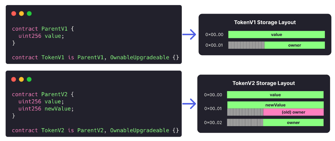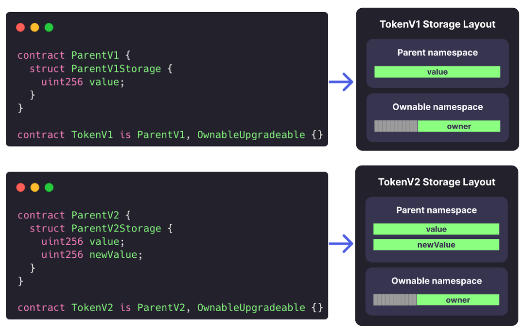 通过为变量设置命名空间,每个继承的合约将保留自己的存储指针,在后续升级后可以轻松地容纳更多的值。
