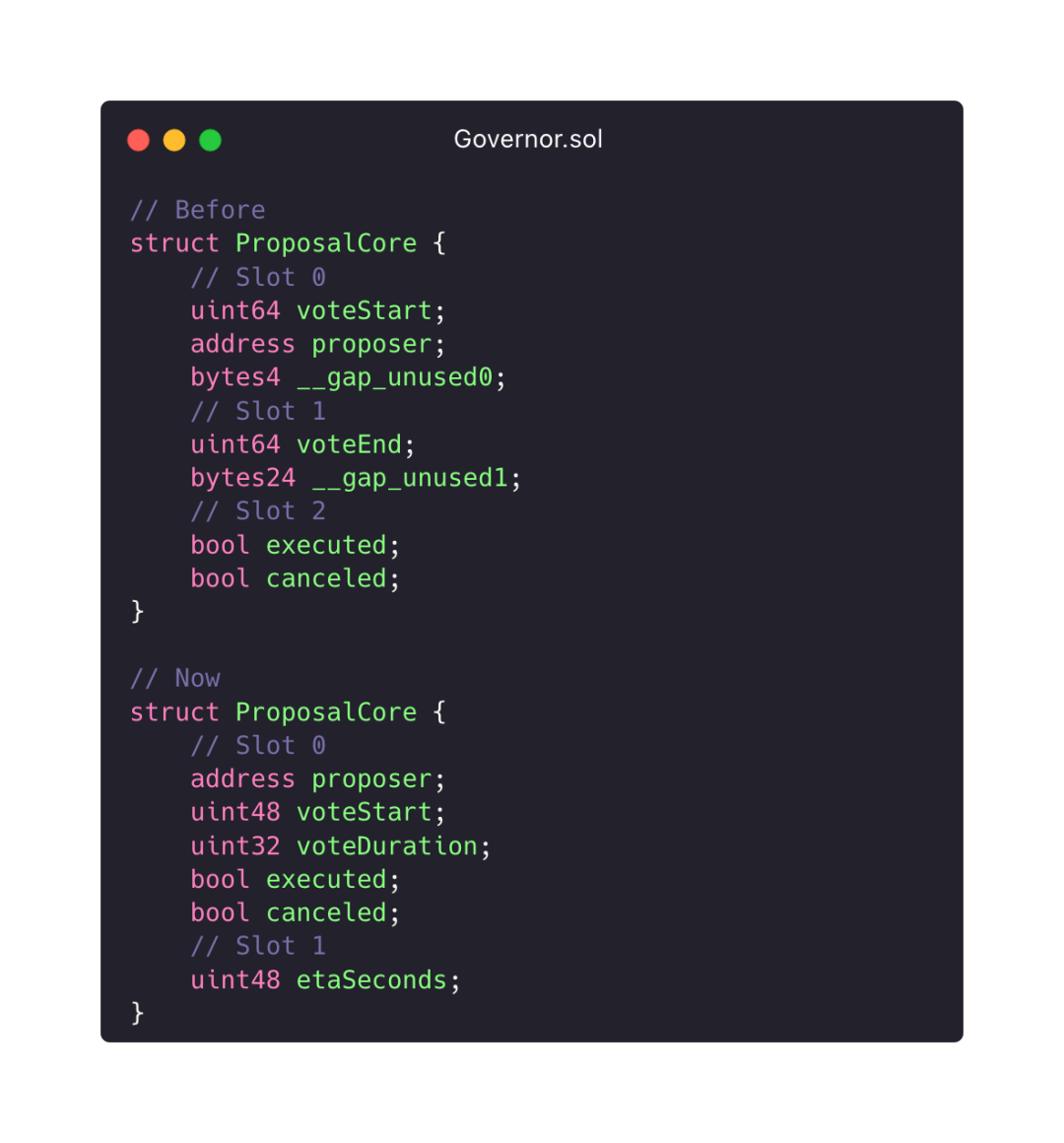 这种策略的一个例子可以在更新的 Governor 提案结构中找到,它以前存储在 3 个槽中,并为了向后兼容性而添加了多个存储间隙。它的新结构只使用了 2 个槽,并且常常一起使用的变量共享同一个槽,减少了不必要的存储读取,提高了 gas 的使用效率。