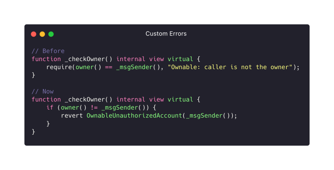 自定义错误为开发人员提供了更高效和标准化的方式来报告智能合约中的错误,还可以包括动态参数。