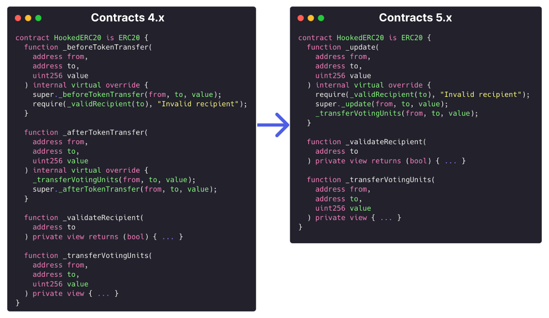 在 5.0 版本中,我们从 ERC20、ERC721 和 ERC1155 中删除了 token Hook,而是采用了一个单一的 _update 函数。这也可以在任何 mint、transfer 或 burn 操作中进行自定义行为的重写。