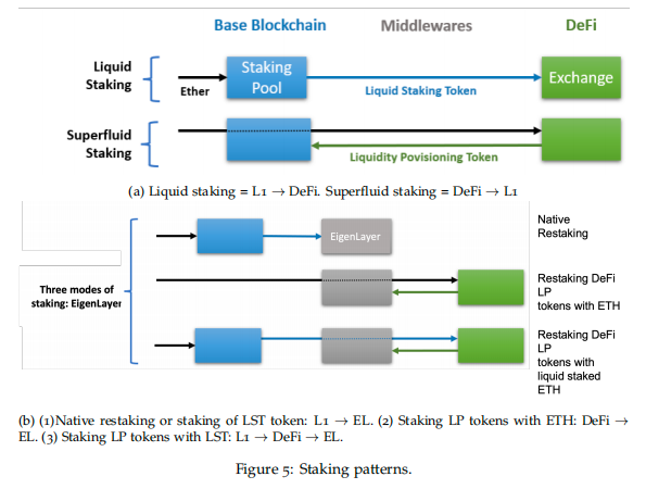 EigenLayer 提供多种质押方式类似于 Lido 的流动性质押(Liquid Staking) 以及超流动性质押(Superfluid Staking),其中超流动性质押可以允许 LP 对 的质押,具体而言: