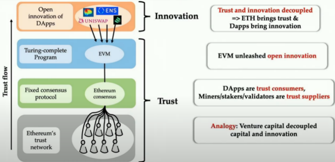然而,这导致了信任和创新的脱钩,质押者和验证节点提供信任,用于保证网络安全性,而 dApps 则消耗这些信任,并为以太坊共识层所提供的信任和安全支付溢价