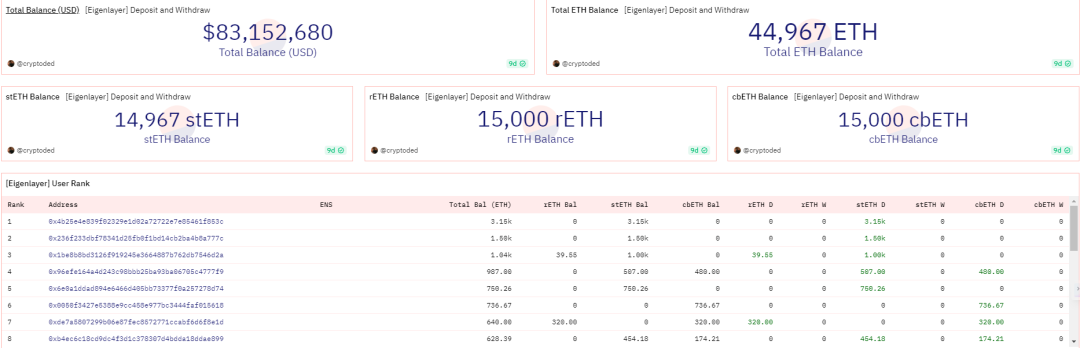 再质押量:再质押量是指通过 EigenLayer 再质押的 ETH 或流动性代币的数量, 它反映了质押者对 EigenLayer 的信任和参与程度,也反映了 EigenLayer 的市场 占有率和收入规模。再质押量越高,说明 EigenLayer 越受质押者的欢迎和支持, 也说明 EigenLayer 越有竞争力和影响力。再质押量是一个容易量化和衡量的因 素,可以通过 EigenLayer 官网或其他数据平台获取。