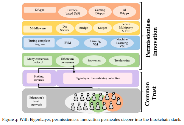 以太坊的更新目前通过稳健的链下民主治理方式缓慢推进,EigenLayer 可以让创新快速地部署在以太坊的可信层上,像一个测试网一样为以太坊主网的创新提供测试和经验,避免了以太坊在快速创新和民主治理之间的取舍。