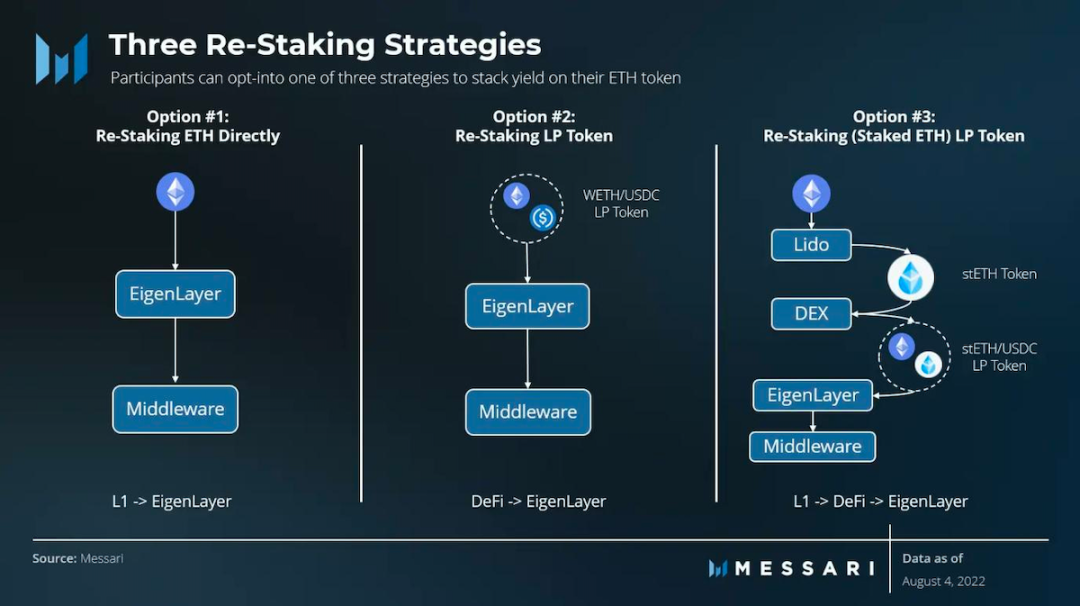 ETH 持有者可以通过三种模式在 EigenLayer 中进行 Re-Staking。第一种是直接将质押在 PoS 链上的 ETH 通过 EigenLayer 进行再质押;第二种是将包含 ETH 的 LP 代币通过 Eigenlayer 进行再质押;第三种是可以将包含 stETH 的 LP 代币通过 EigenLayer 进行再质押。