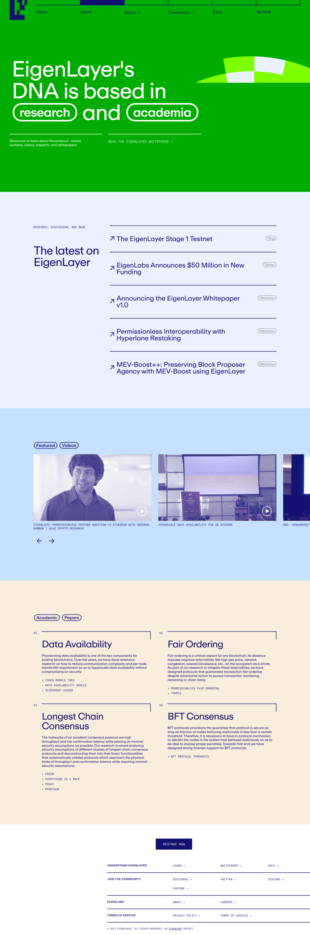 Eigen layer 是一个基于 ETH 质押市场的再质押协议,由 EigenLabs 于 2021 年 开发 , 团队主要位于美国 ,项目当前未发行代币 ,但是可能在未来推出 。 Eigen layer 目前处于第一阶段主网阶段,已经吸引了许多验证者和协议的参与。