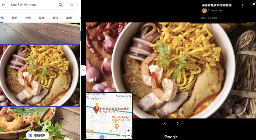 清迈,古城内人口不到 20 万,数公里长的 800 年城墙残桓与护城河环抱着它,年平均气温 22 摄氏度,是东南亚避暑胜地,在清迈夜间动物园与 1400 多种野生动物近距离接触,是邓丽君《小城故事》的小城,她最喜欢的面馆叫 Kao Soy Nimman,在谷歌地图上用中文直接搜“邓丽君最爱泰北咖喱面”就能找到。