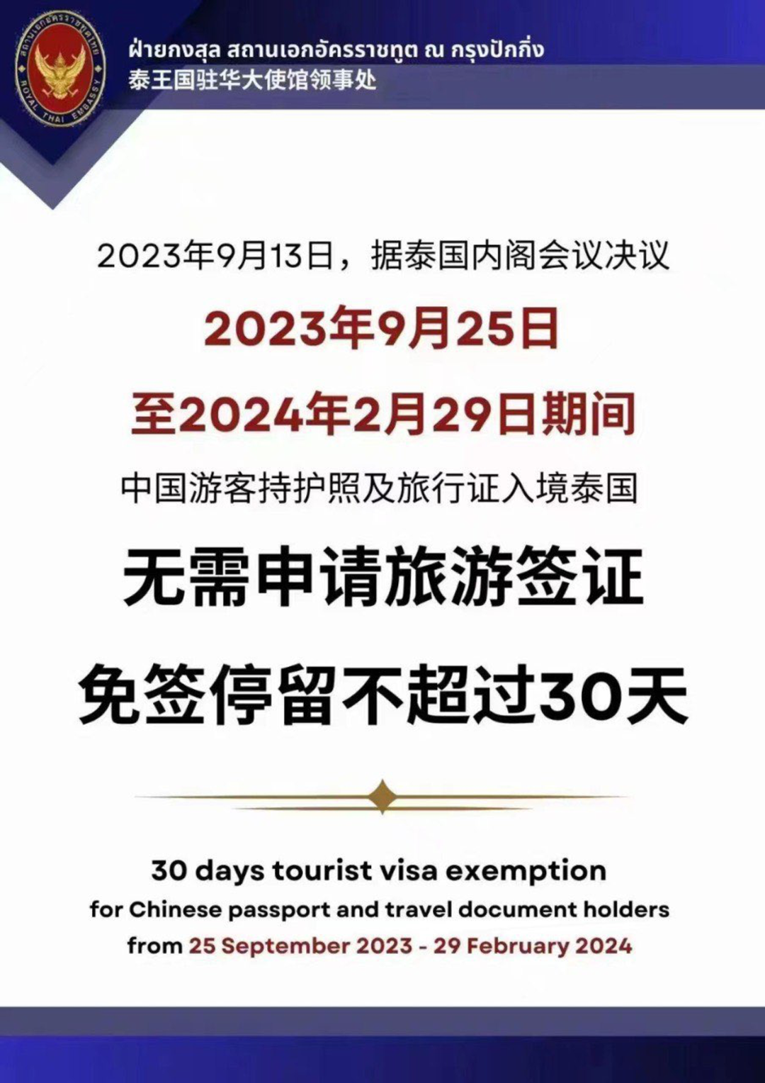 9 月 13 日,泰国内阁会议作出决定,对中国游客实施为期 5 个月的免签政策。免签时间段为 2023 年 9 月 25 日至 2024 年 2 月 29 日。