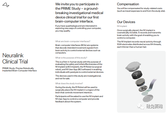 据 Bloomberg11 月 7 号的报道,马斯克创立的专注于开发植入式脑机接口(Brain Computer Interface, BCI)技术的公司Neuralink开始招募人员参与其首次人体临床试验的测试了。实验将会于明年开始,优先考虑 40 岁以下,四肢瘫痪的成年人,目前报名的人数已经高达数千人。Neuralink 计划在明年进行 11 例脑机接口手术,以后逐年增加,到 2030 年将为超过 2.2 万人进行植入手术。这个项目已经开始广泛征集测试人员,那些因颈脊髓损伤或肌萎缩侧索硬化症 (ALS) 导致四肢瘫痪的患者及其监护人可以在网上提交申请。Neuralink 表示:在获得美国食品药物管理局 (Food and Drug Administration,FDA)的独立审查委员会批准后,他们将开始为瘫痪患者提供大脑植入物,作为PRIME(精确机器人植入脑机接口的缩写)研究的一部分,最初的目标是“让人们能够仅用自己的想法来控制计算机光标或键盘”。换句话说,作为测试者的瘫痪人士,将通过手术在大脑中植入芯片,芯片会将记录的大脑信号发送到对应的应用程序,以传达患者需要表达的需求。Neuralink 在今年上半年获得了 FDA 的人体临床试验许可,很快就拿到了新一轮 2.8 亿美元的融资,其中领投的 Founders Fund 则是由马斯克昔日 PayPal 合伙人、硅谷明星投资人 Peter Thiel 创立的基金。有了这笔巨大的资金,这项为期 6 年的研究项目即将开启。去年,Neuralink 的实验猴子在测试中死亡,美国医师医药责任会对其就提出指控,指控中提到 Neuralink 在 2018 年至 2020 年间对 23 只猴子进行侵入性和致命的大脑实验,违反了《联邦动物福利法》,存在虐待猴子的可能。抛开伦理问题不说,动物保护者们的指责从未停止过,还有一些科学家对信号处理能力在脑科学方面的学术贡献不屑一顾,甚至是层出不穷的、包括脑机接口可能伴随着电子病毒入侵等的各种新奇的问题。如果未来的某个时代开始,人类脑中可以自主选择植入芯片,无需学习便可以获取海量知识、靠意念就可以接收传达信息,就像 airdrop 一样自然,能达成这种目标的就一定是 BCI 技术。无论是科幻小说里的主角人物设定,还是漫威电影里经过改造的超级英雄们,都无不展示了这种新技术在未来世界的可能。如果你是个科幻迷,对 BCI 技术定然不会陌生。因为一直以来,科幻电影伴随着我们一部分人的成长。从 1999 年的电影《黑客帝国》中现实世界的人类需要通过插入连接器的方式进入到“母体”世界中,这种“脑后插管”的方式就是侵入式脑机接口;到 2009 年《阿凡达》中科学家们通过感应舱,让人大脑与阿凡达感应同步,实现人的思想进入阿凡达体内也是基于脑机接口的设定。2010 年的《盗梦空间》中出现可进入他们梦境的可穿戴设备,通过进入梦境去与之互动,传递信息;再到《星球大战》中通过意念控制物体的“原力”、《银翼杀手》里的人类增强技术 interlink、2018 年的《头号玩家》里名为“奥尔森协议”的脑机接口技术,玩家通过意念进入虚拟现实中;又或者是《阿丽塔:战斗天使》里半机械人的赛博世界、今年上映的《流浪地球 2》里的数字生命这些黑科技都是 BCI 技术的分门别类。一直被说是“钢铁侠原型”的首富马斯克就深受早期科幻小说和电影的启发。由 Walter Isaacson 撰写的马斯克最新传记一书中就有提到,马斯克受到 Iain Banks 等科幻小说作家的启发,追求一种“称为‘神经蕾丝(Neural Lace)’的人机界面技术,该技术被植入人们体内,可以连接他们所有的想法到电脑。”Neuralink 从 2017 年成立以来,就一直在研发名为“神经蕾丝”的一种超薄网状神经植入物,意在植入颅骨,形成一个用于监测大脑功能的电极单元。Neuralink 的“神经蕾丝”一旦在人类大脑正常运转,那么将造福很多人类,比如阿尔茨海默症或脊椎损伤类的患者,可以有效帮助他们找回失去的记忆、视觉听觉等知觉。如果取得进一步发展,就可以将电脑内的信息注入脑神经细胞,来体验更为真实的虚拟现实。BCI 技术发展初期,主要是为了治疗患有注意缺陷与多动障碍的儿童或者患有重度身体障碍的残障人士,因而被广泛运用来医学领域。如今,BCI 开始与 AR 增强现实等技术相结合,正在往更多元化的方向飞速发展。如果 BCI 技术更进一步,我们甚至可以自主控制感情以此来消除恐惧、悲伤等,或者具有巨大的大数据分析能力,“读心术”、“心灵感应”这些都会被实现。Neuralink 创立的目标也在于此,就是达到能够读懂人心,用脑电波进行沟通的高度。在 BCI 技术圈子里非常有影响力的未来学家 Raymond Kurzwei 博士就预测:到 2035 年,我们的大脑将会顺利地连接到云端。到那个时代,也许所有的教育系统都将重大变革并洗牌,很多职业会改革或者消失,人类对于“学习”的方式也会重新被定义。如果大脑能整合进机器体内,似乎为不依靠肉体而永生提供了方法,而这又是另一种新时代的来临了。