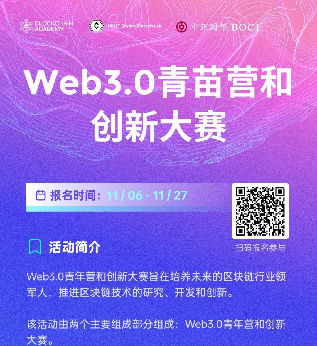 Blockchain Academy,坐落于香港,致力于培养和发展下一代 Web3 领域人才。我们的社区已经迅速扩展,覆盖了亚洲各地,目前已有超过万名活跃社区成员。Blockchain Academy 不仅得到香港科技大学、香港大学、香港中文大学等知名大学的支持,还与行业领袖建立了长期合作伙伴关系。我们的使命是充分利用我们的平台资源,致力于推动 Web3 教育,促进大规模采用,为创业者、项目创始人以及杰出的 Web3 项目提供支持,助其茁壮成长。