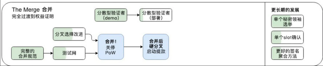 The Merge 大合并板块是以太坊升级中最引人注目的板块。因为以太坊会在这个升级中的共识机制从 PoW)切换为 PoS。这意味着不再需要实体计算机运行节点,而是质押 ETH 代币来维护网络的安全性。