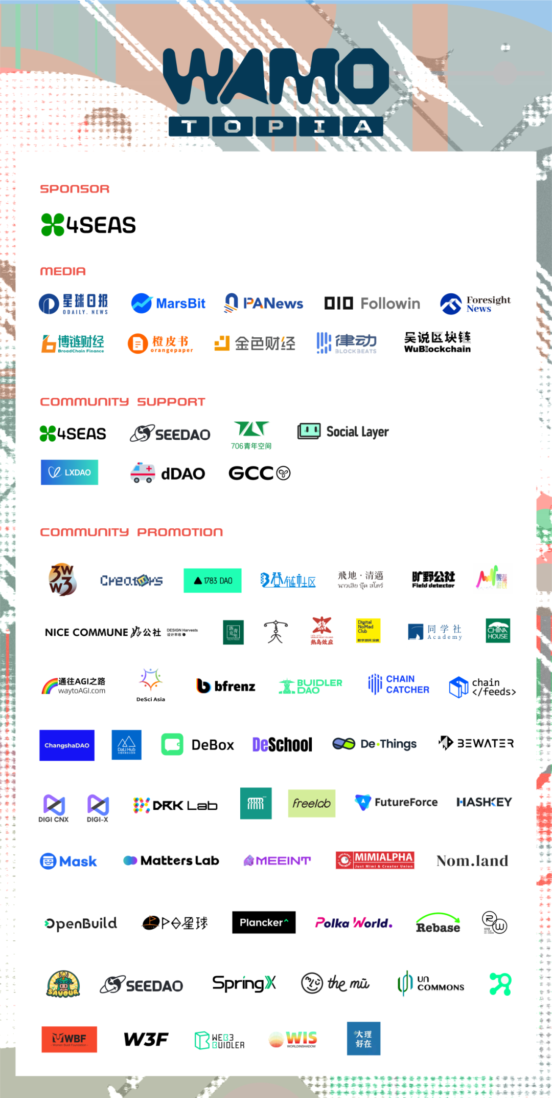 邀请 Plancker 社区的好朋友们(深度共建的社区伙伴们)一起打造 WAMO 2 活动期间的共同主题营地,形式是以 Workshop 来开展活动,但是每个社区都有各自的特色和想要表达的 Workshop 分享话题,我们通过「公共物品」的共同主题下聚集,在同一天各自策划各自的 Workshop 主题,场地在同一片区域但是不同会议房间开展,对于参会成员来说 Ta 可以自由的选择不同感兴趣的社区 Workshop 串场听讲。我们彼此社区之间可以出现邀请嘉宾互相重叠的情况,可能同一个嘉宾参与的具体时间和话题讨论不一样而已。