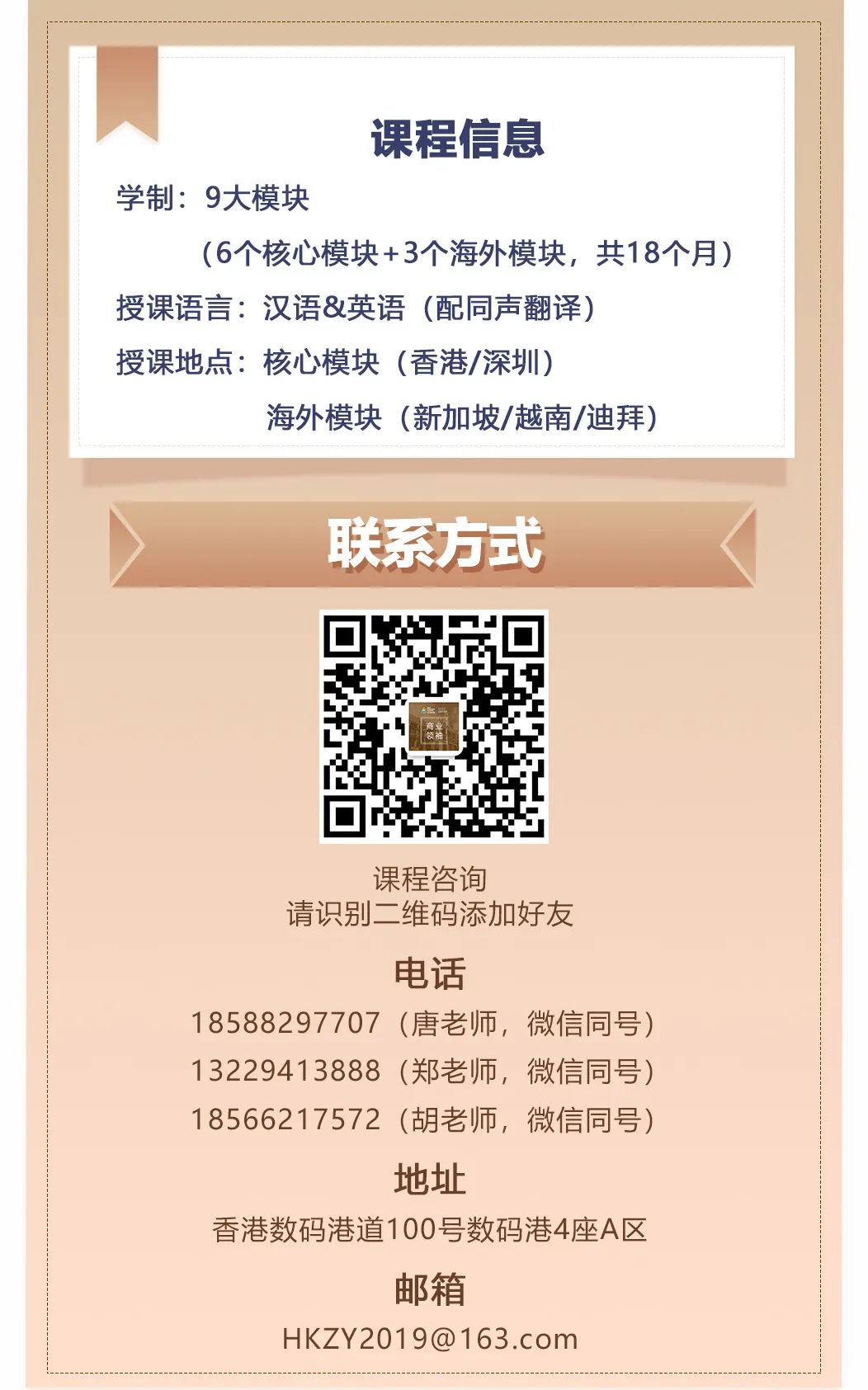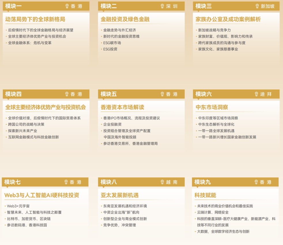 结合当下时代背景及经济环境,我们对课程模块进行了创新与升级:包括动荡局势下的全球新格局、金融投资及绿色金融、家族办公室及成功案例解析、全球主要经济体优势产业与投资机会、香港资本市场解读、中东市场洞察、Web3 与人工智能 AI 硬科技投资、亚太发展新机遇、科技赋能等九个模块。其中海外模块将在新加坡 / 越南 / 迪拜进行教学与实地参访。