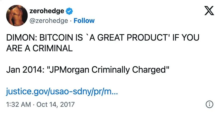 还记得杰米 - 戴蒙(Jamie Dimon)大喊大叫说比特币「最终会爆炸的骗局」,「如果他是政府,他就会关闭比特币」,加密货币的唯一「真正用途是犯罪、贩毒、洗钱和避税」吗?