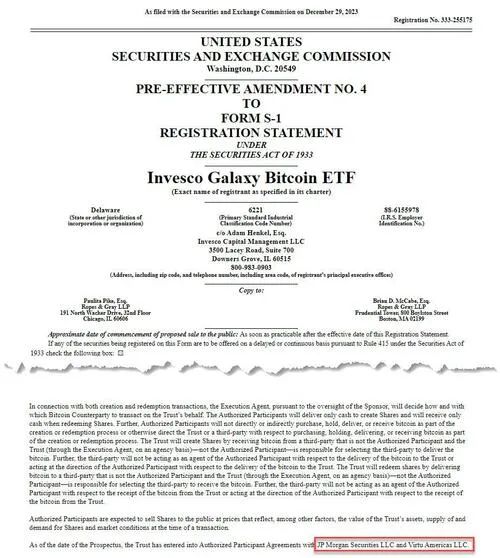根据周五晚些时候提交给美国证券交易委员会的修订招股说明书,摩根大通将成为贝莱德 iShares 比特币现货 ETF 和 Invesco Galaxy 比特币 ETF 的授权参与者。因此,他们将负责处理 ETF 一篮子股票的创建与赎回,以及基金管理人之间的现金转账。