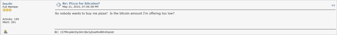 所以,5月21日晚上7点零6分,拉斯洛还曾发帖直言:“所以,没有人想给我买披萨?我提供的比特币数量是否过低?”