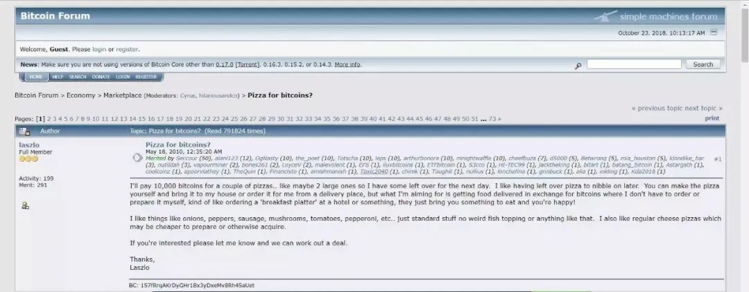 时间回到2010年5月18日中午12点35分20秒,一个网名为拉斯洛(Laszlo,本名Laszlo Hanyecz)的程序员,在Bitcoin Forum论坛发了一个用1万比特币换取两块披萨的求助帖。其内容翻译为中文后大致为: