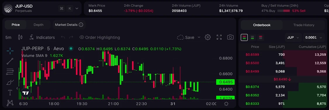 Aevo 数据显示,JUP 的 pre-lanuch 合约当前价格暂报 0.6455 美元,过去一个月内最高曾冲至 0.8464 美元,最低则曾跌至 0.2620 美元。