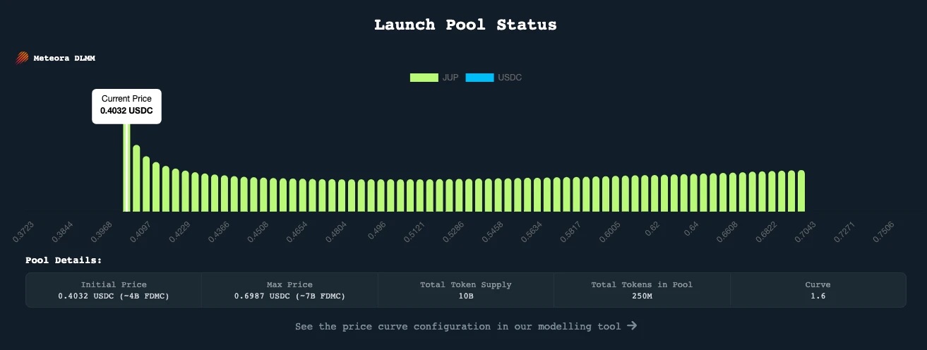 LFG Launchpad 数据显示,JUP 的启动池合计共投入了 2.5 亿枚代币用于构建初始流动性,JUP 的价格区间被设定为 0.4032 USDC - 0.6987 USDC,斜率曲线为 1.6 。