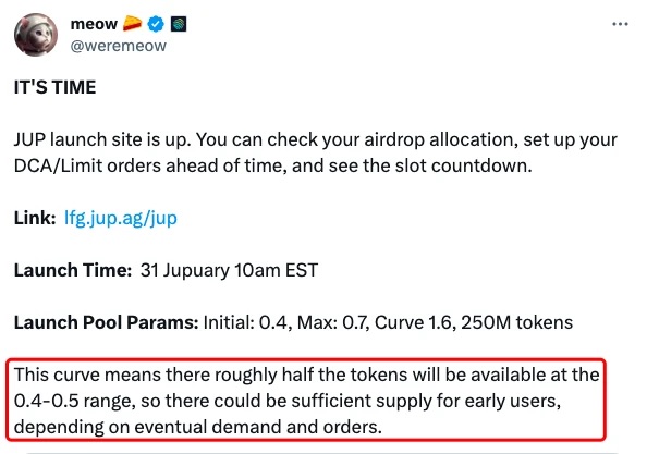 meow 就此斜率区间解释道,1.6 的斜率意味着启动池中大约一半的 JUP 将分布在 0.4 USDC - 0.5 USDC 的价格范围。