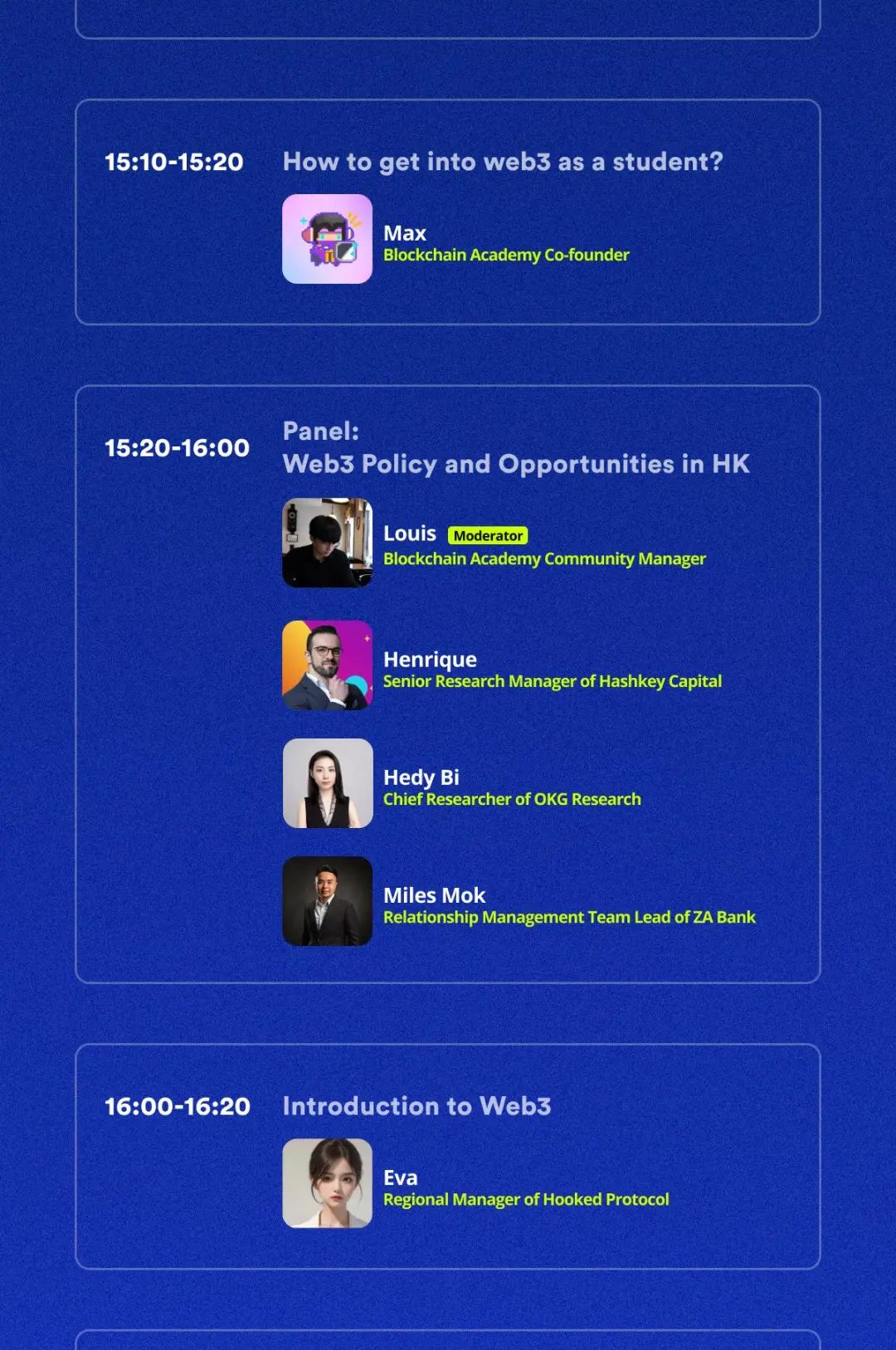 Blockchain Academy,坐落于香港,致力于培养和发展下一代 Web3 领域人才。我们的社区已经迅速扩展,覆盖了亚洲各地,目前已有超过万名活跃社区成员。Blockchain Academy 不仅得到香港科技大学、香港大学、香港中文大学等知名大学的支持,还与行业领袖建立了长期合作伙伴关系。我们的使命是充分利用我们的平台资源,致力于推动 Web3 教育,促进大规模采用,为创业者、项目创始人以及杰出的 Web3 项目提供支持,助其茁壮成长。